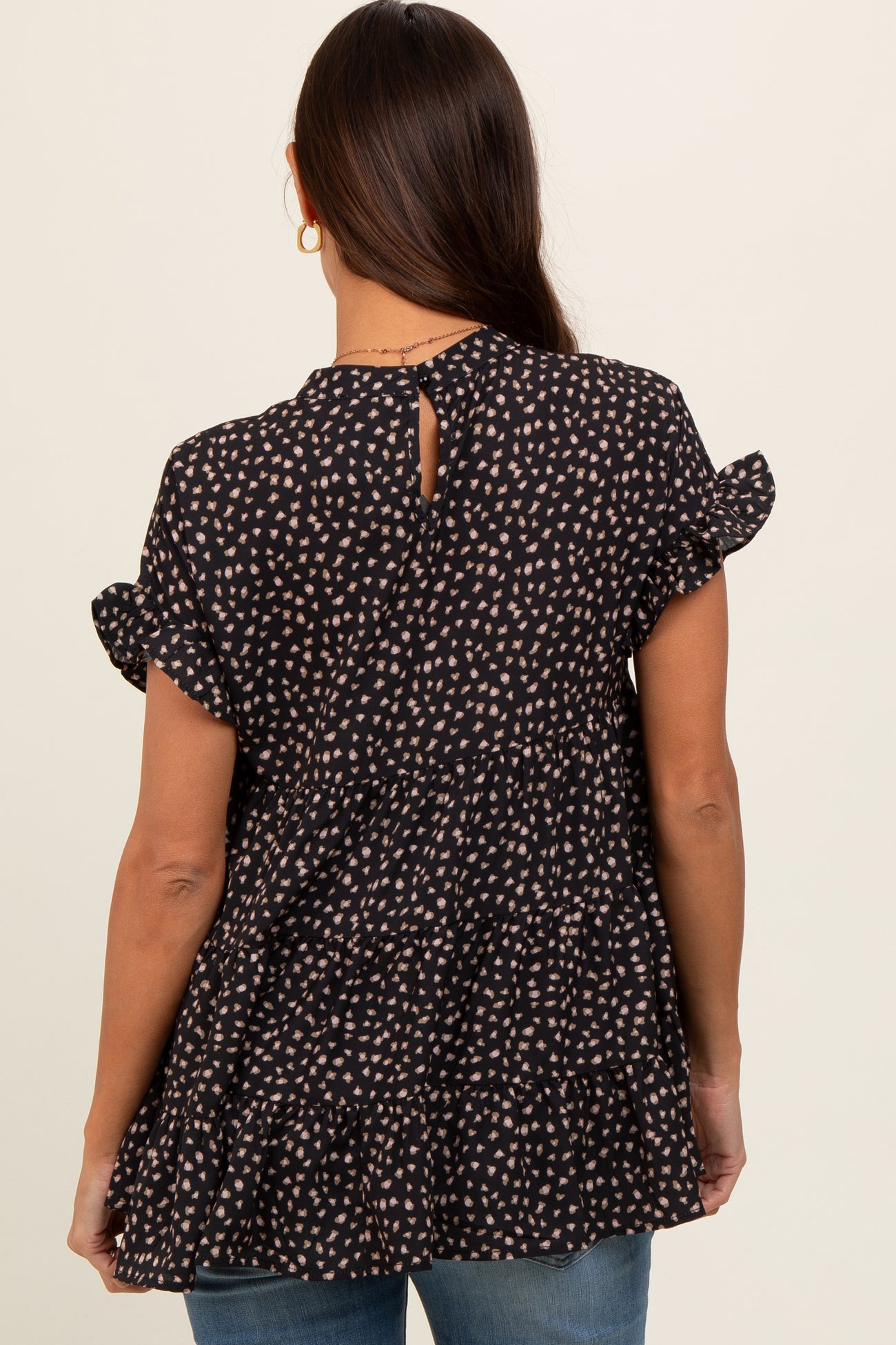 An animal print maternity top featuring short ruffle sleeves, a tiered body, a rounded neckline and a back keyhole cutout with a button closure.