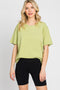 A basic, solid t-shirt featuring a cropped length, a rounded neckline, and short sleeves. Fabric is soft to the touch.