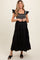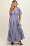 A solid maternity midi dress with smocked bust, embroidery, and tiered skirt.