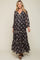 A floral maternity maxi featuring a v-neckline, front functioning buttons, long semi sheer sleeves, and a tiered skirt. Dress is lined 3/4 of the way down.