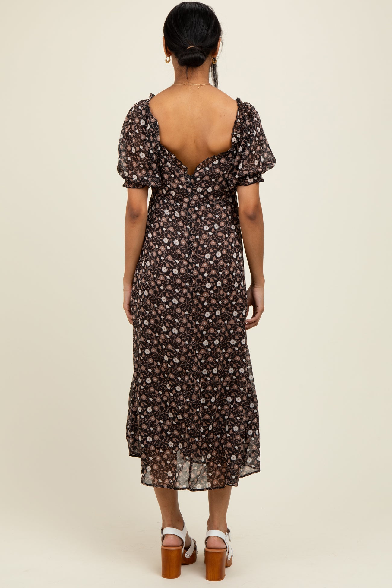 Black Floral Chiffon Sweetheart Puff Sleeve Midi Dress