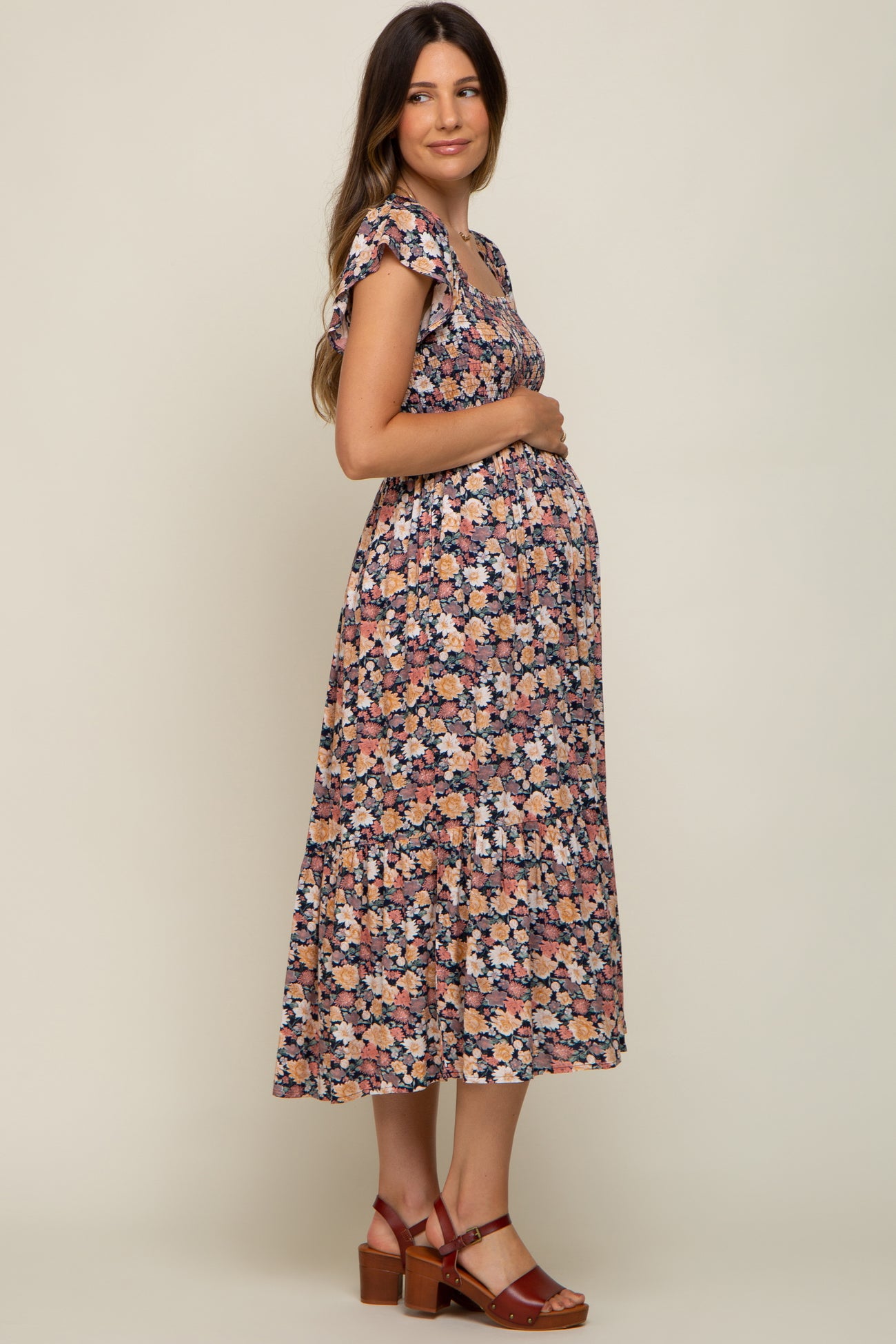 A floral print maternity midi dress featuring an off-shoulder neckline, short flutter sleeves, a smocked elastic top, side pockets and a ruffle hem.