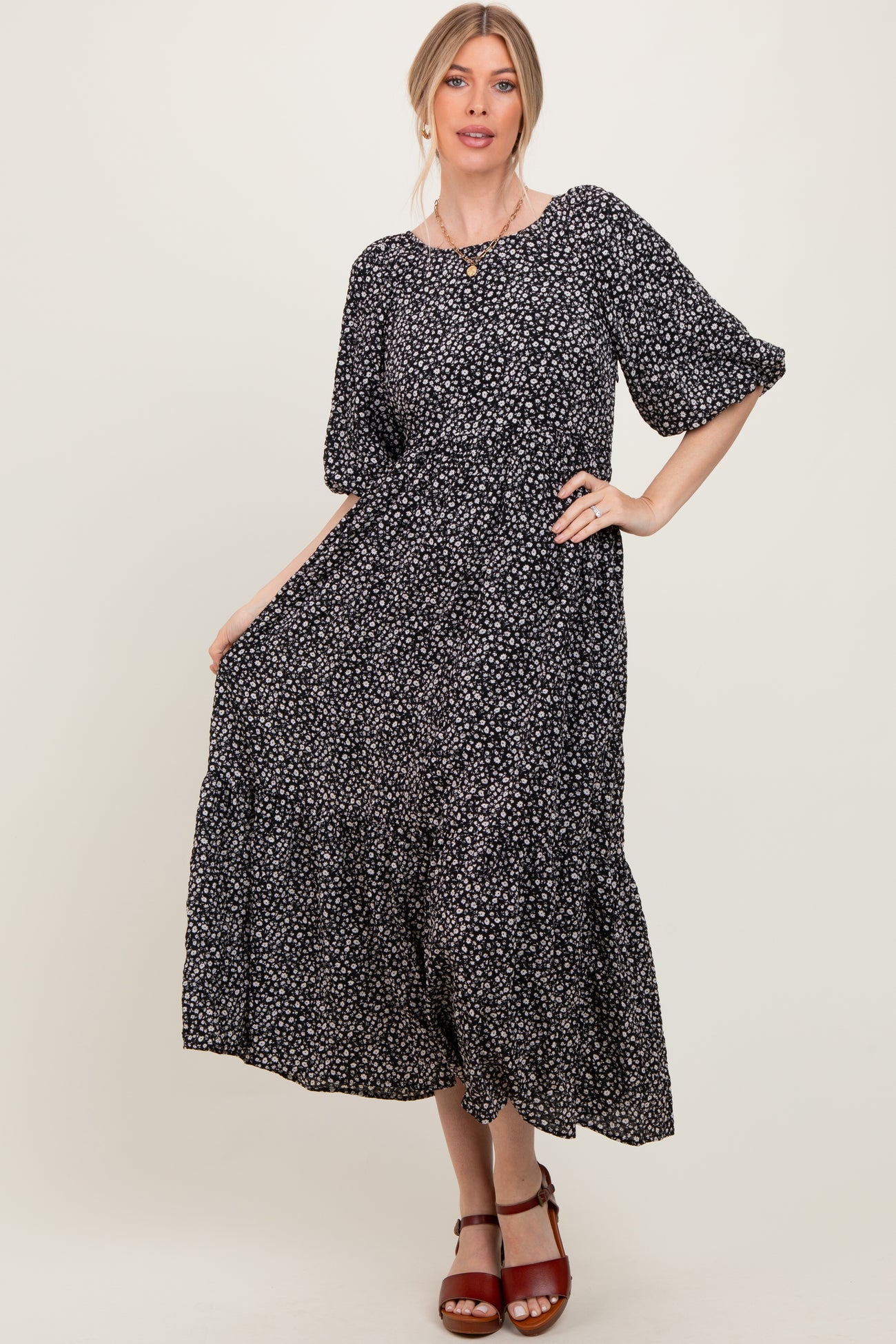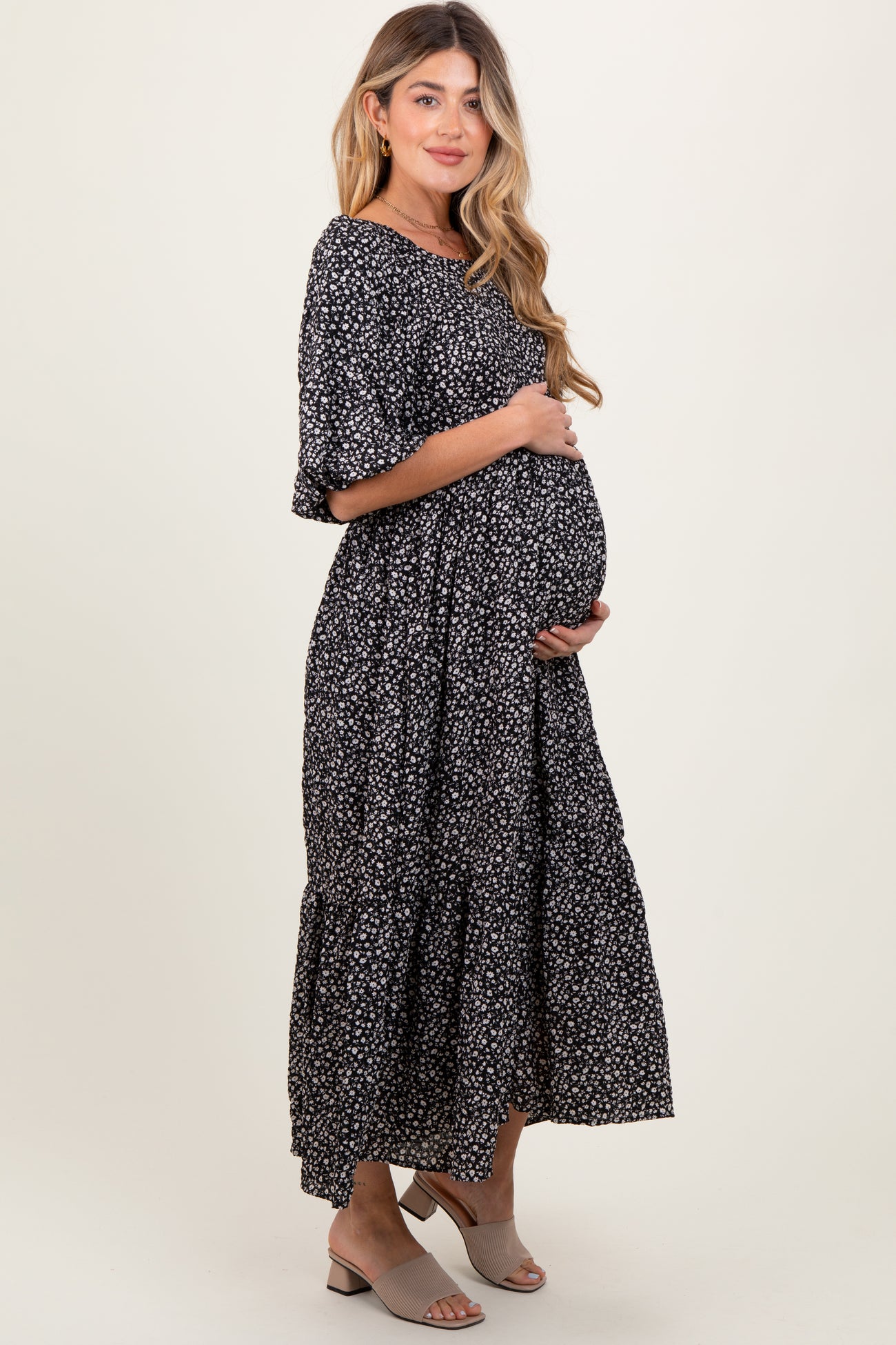 Black Floral Puffed Short Sleeve Maternity Maxi Dress