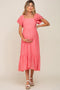 A floral print, shimmer knit maternity midi dress featuring a deep v-neckline, adjustable satin strap ties, a tiered skirt and double lined.