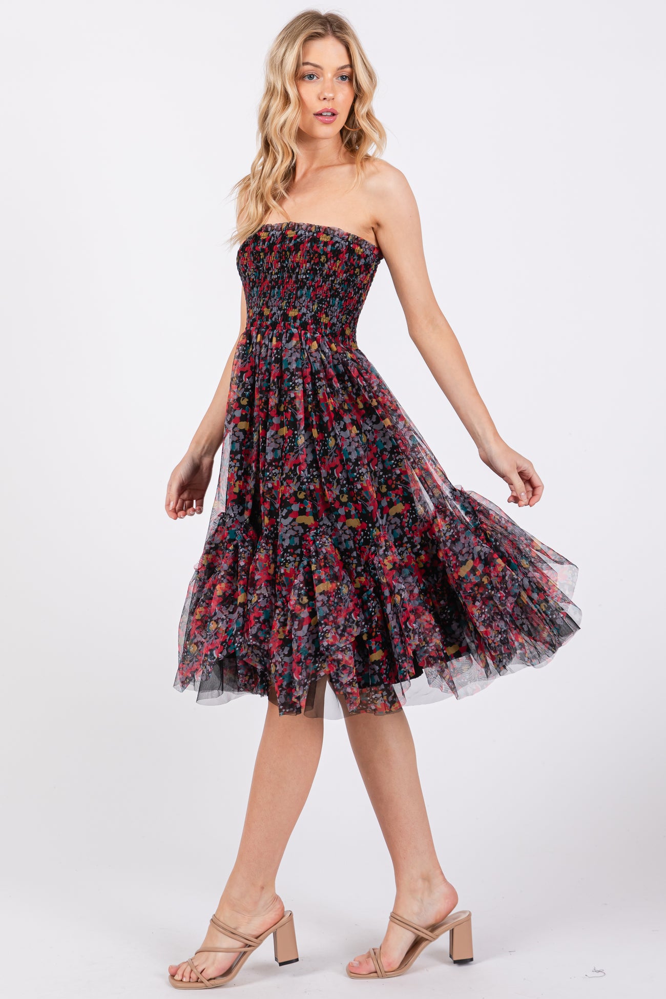 Black Floral Sleeveless Smocked Ruffle Hem Dress