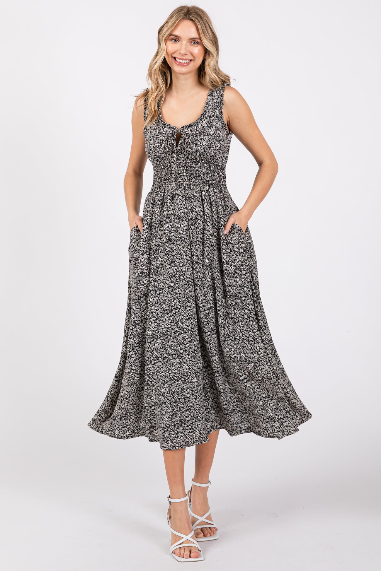 A floral sleeveless maternity midi dress featuring a smocked waist, side pockets and a self-tie keyhole cutout neckline. Double lined.