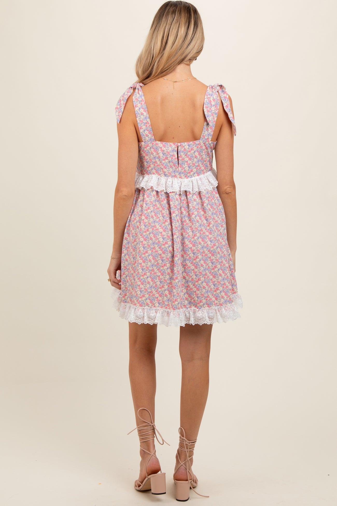 A floral print maternity dress featuring a square neckline, adjustable tie straps and lace trim.