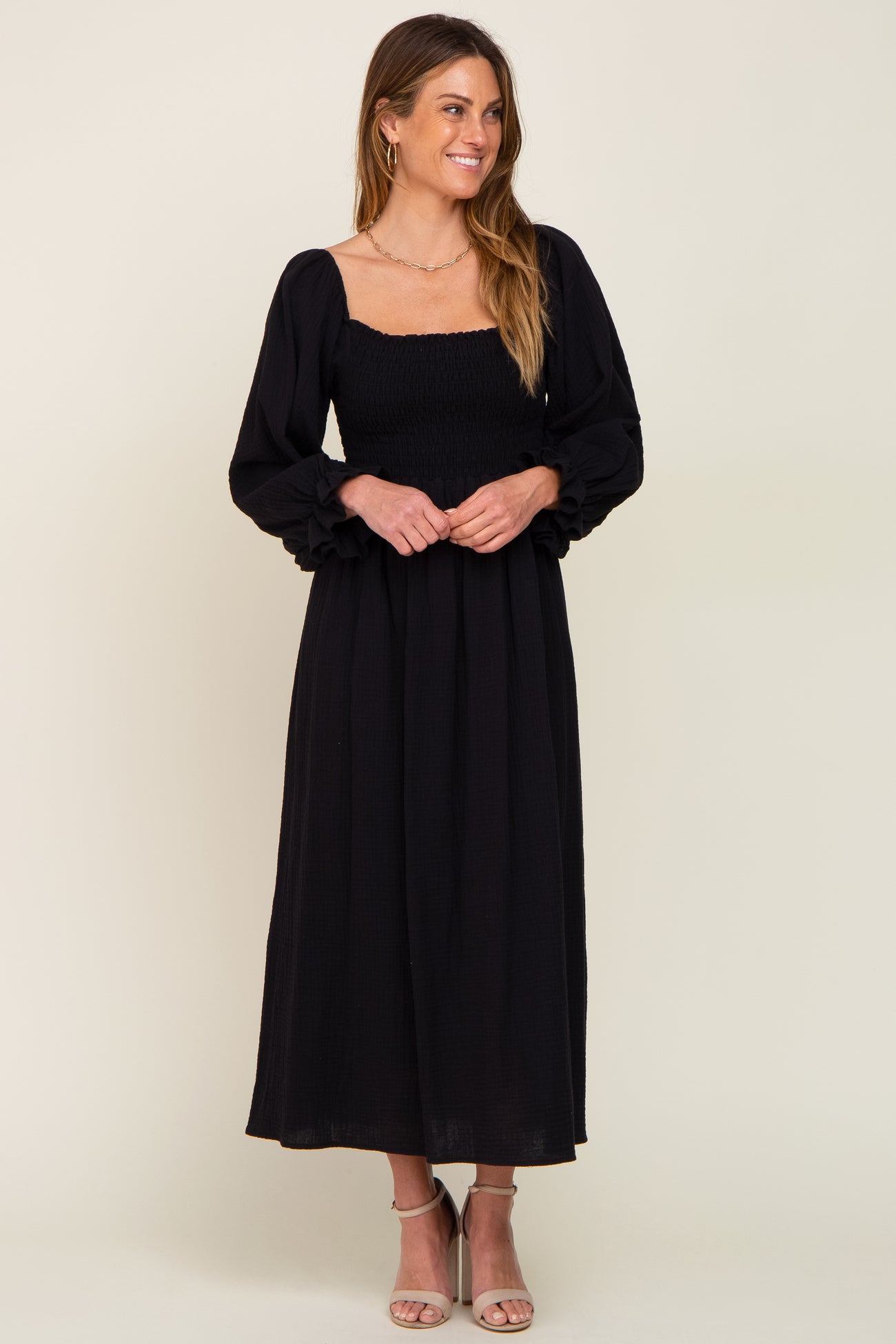A lightweight maternity midi dress with a squared neckline, long cinched sleeves, and a smocked top.