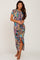 A multi-color floral maxi dress featuring short sleeves, side ruching, a side slit and a rounded neckline.
