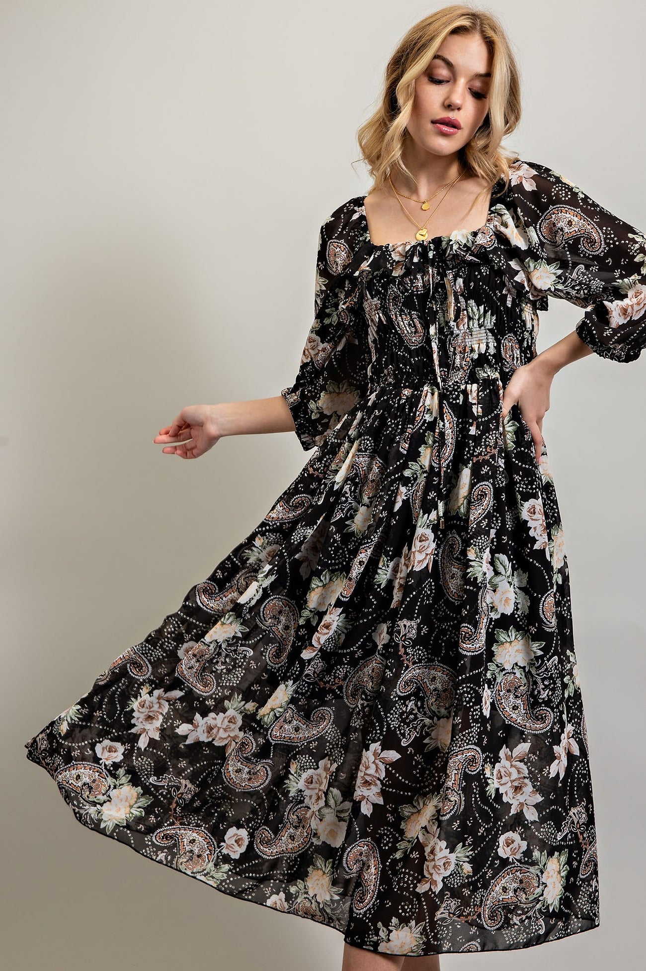 Black Multi Floral Chiffone Print Midi Dress