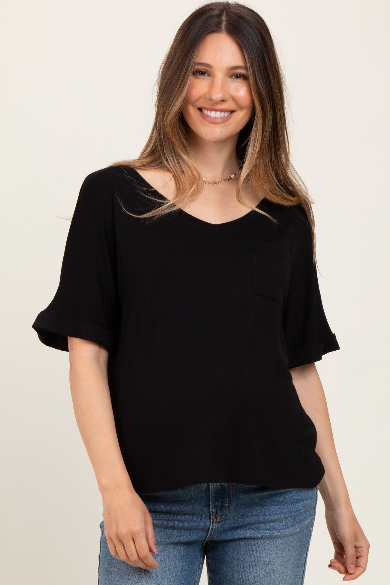 Black Oversized V-Neck Front Pocket Maternity T-Shirt