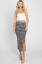 A printed shirt in a long length. Includes collared neckline, button down front closure, two front chest pockets and two side pockets.