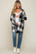 A plaid print knit maternity cardigan with a shawl neckline and open front. Features two pockets.