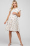 A pleated maternity midi dress with a sweetheart knot top, a front cutout, long sleeves, a back cutout with a back tie, and a lettuce hem.