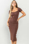 A ribbed midi dress featuring a straight neckline, adjustable straps, and a back slit.