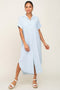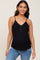 A solid ribbed maternity cami top with adjustable straps and a snap button front detail. Rounded hem.