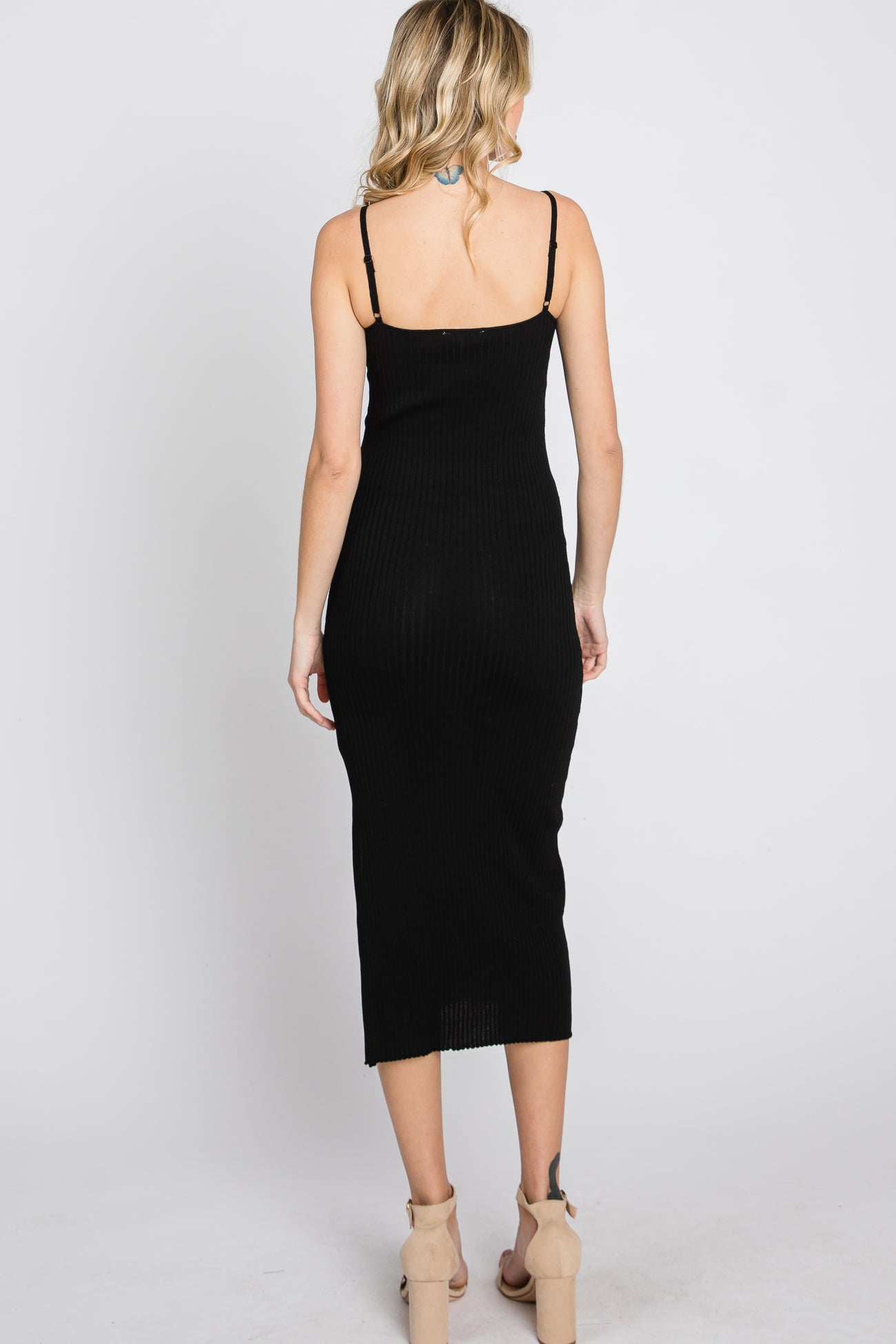 A ribbed knit midi dress featuring a square neckline, adjustable cami straps and a side slit.