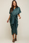 A satin maternity blouse featuring a rounded neckline, long puff sleeves, a sequin cuff with two buttons and a keyhole back with a single button closure.
