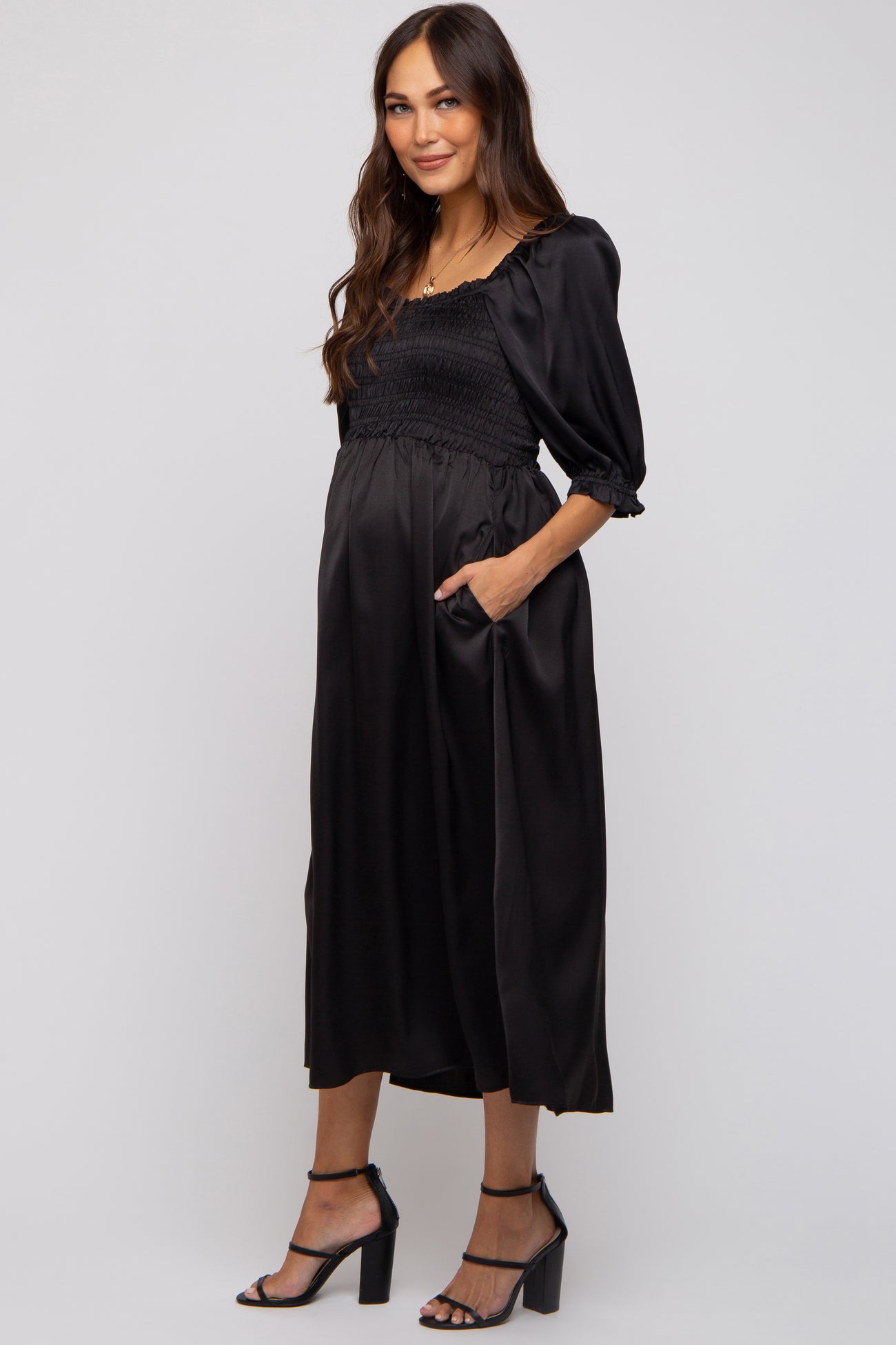 A solid satin maternity midi dress with a smocked square ruffle accent bust, puff sleeves and side pockets.