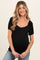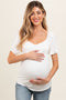 A solid hued maternity top featuring short puff sleeves and a v-neckline.