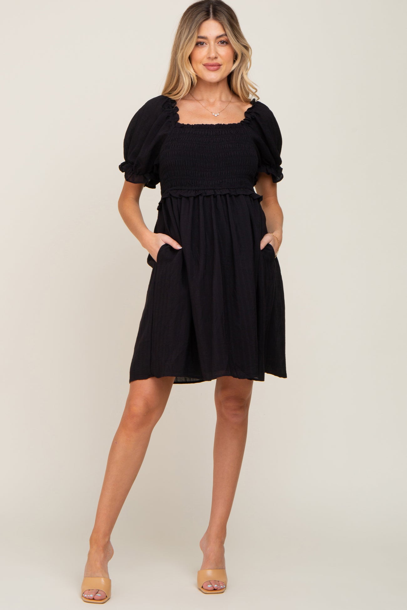 A solid hued maternity dress featuring short puff sleeves, a smocked top, ruffle accents and a ruffled square neckline. Skirt is double lined.