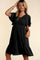A solid midi dress with a smocked bust, flutter sleeves and ruffle hem. Pocketed.