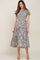 A printed maternity midi dress featuring a smocked elastic top with a button closure at the back, ruffle cap sleeves, and a tiered skirt with ruffle trim.