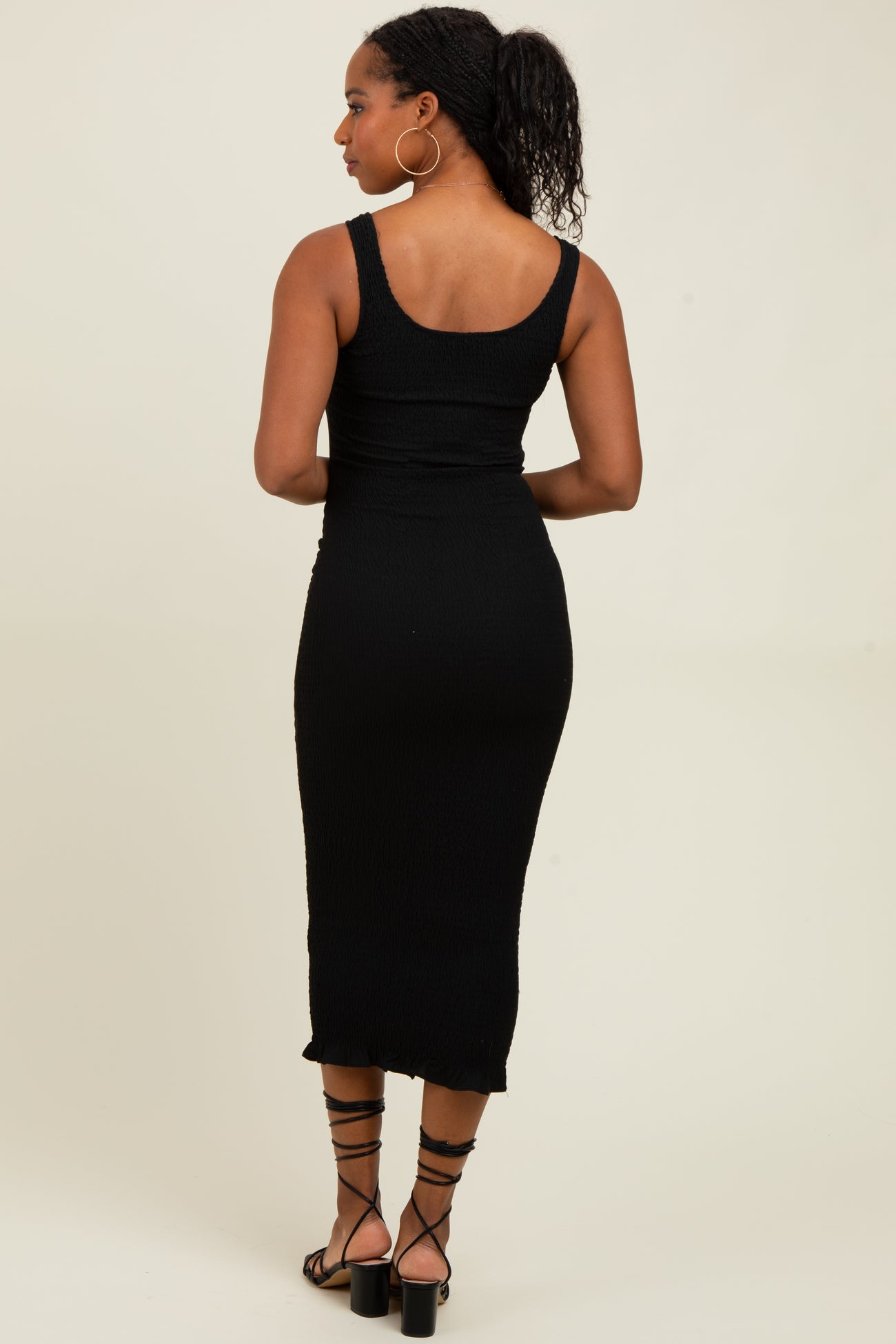Black Smocked Sleeveless Ruffle Hem Fitted Dress