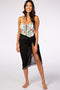 A solid hued midi dress featuring sleeveless with self-tie straps, smocked bust, and ruffle trim on hemline.