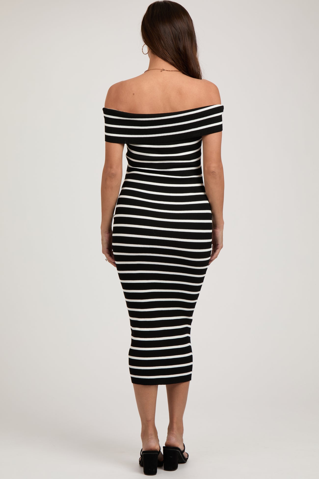 A striped ribbed knit maternity midi dress featuring an off-shoulder neckline.