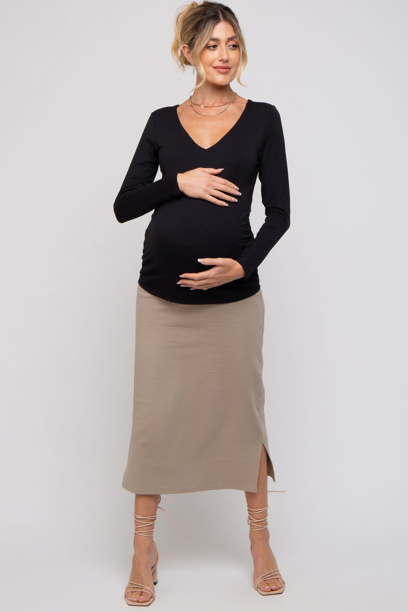 A solid hued maternity top featuring long sleeves and a v-neckline.