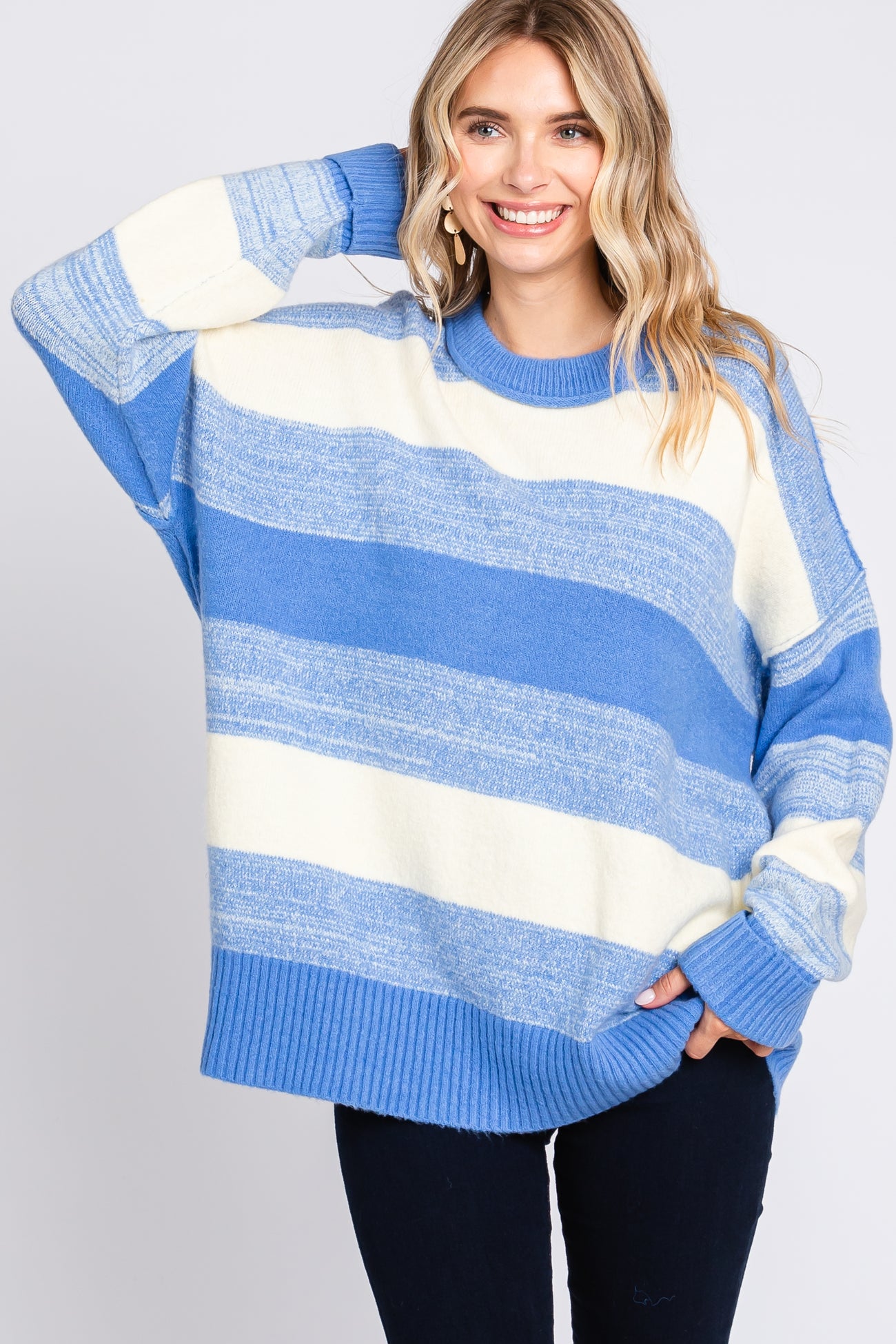 A soft brushed knit, striped maternity sweater featuring a rounded neckline, long cuffed sleeves and a ribbed trim.