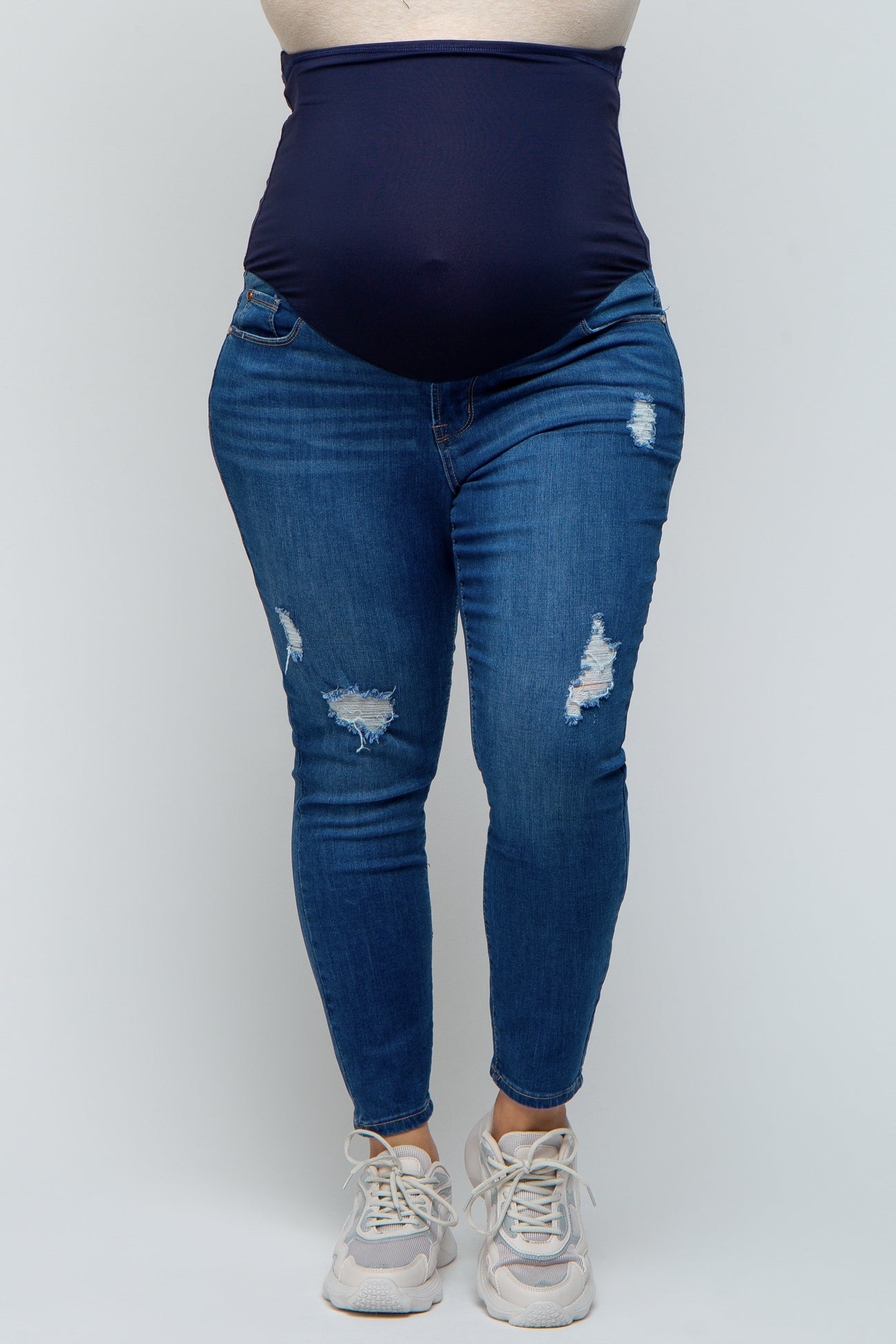 Details A pair of medium wash maternity plus size skinny jeans featuring distressed detailing, 5 pockets and an elastic belly band. Content + Care