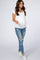 A pair of medium wash maternity jeans featuring distressed detailing, a raw edge hem, five pockets and an elastic belly band.
