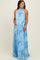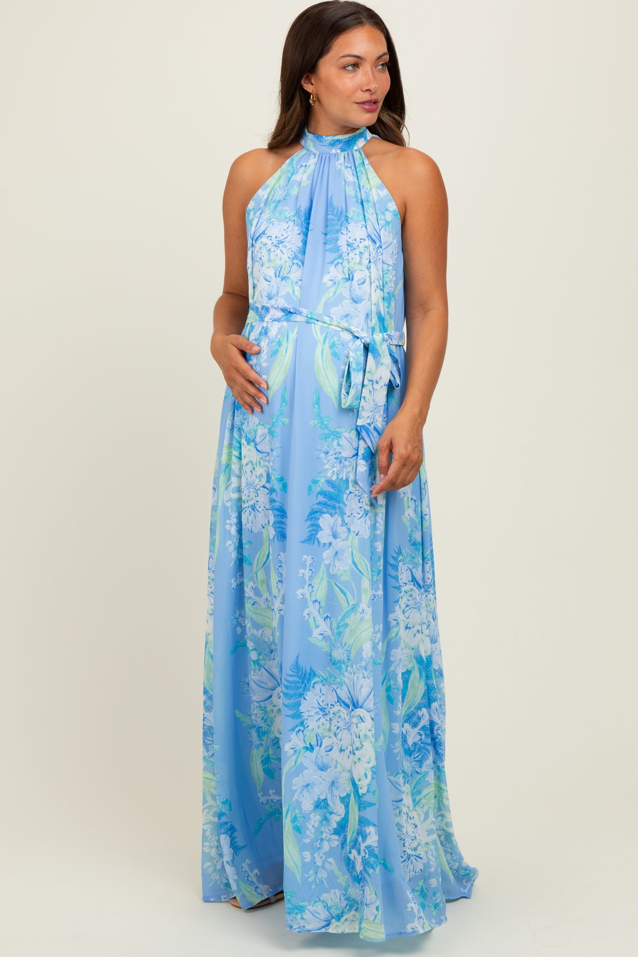 Blue Floral Halter Sleeveless Sash Tie Maternity Maxi Dress
