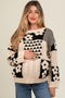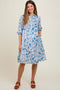 A floral maternity blouse with a ruffle accent round neckline, a keyhole button back closure, and short puff sleeves.