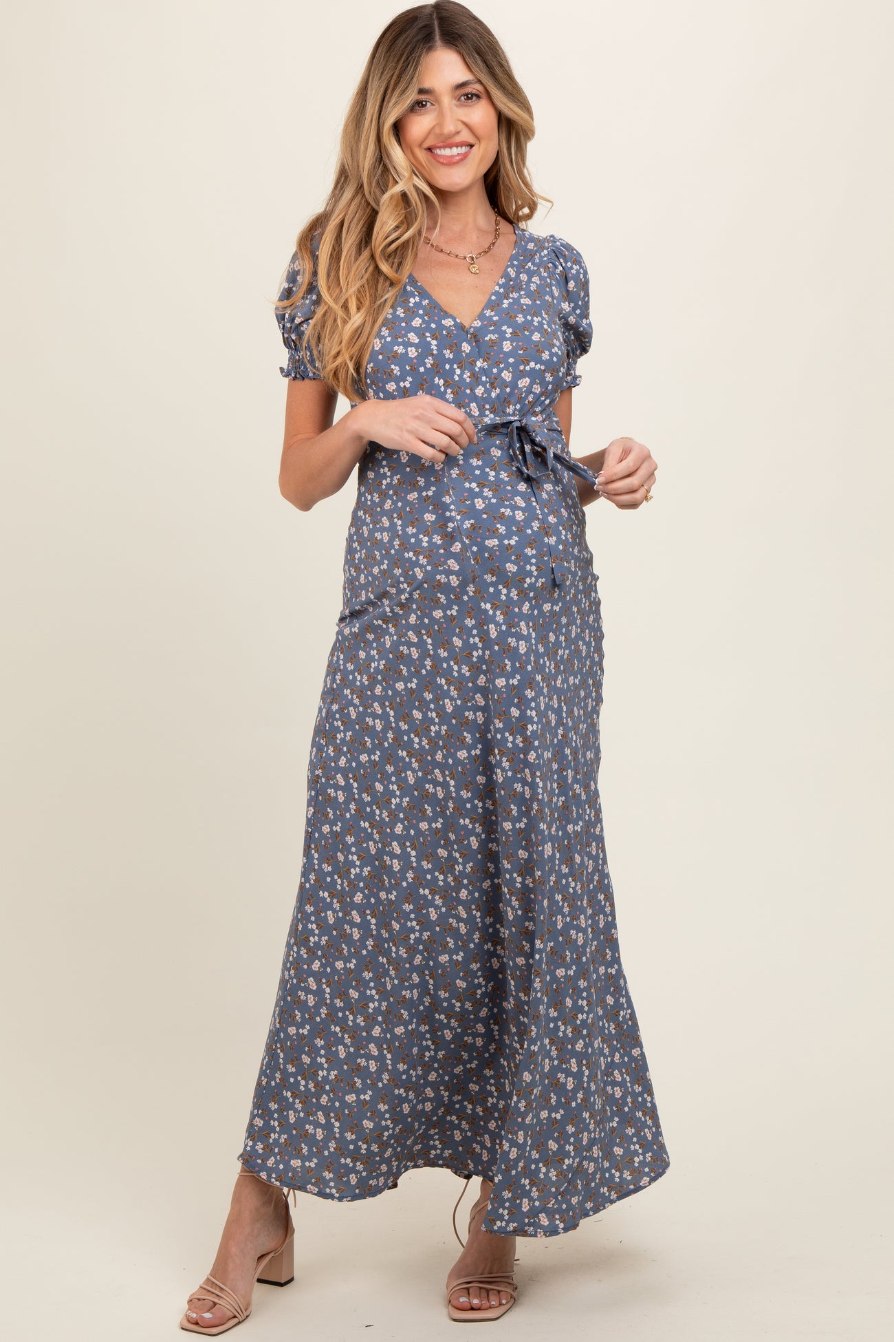 Blue Floral Puff Sleeve V Neck Maternity Maxi Dress