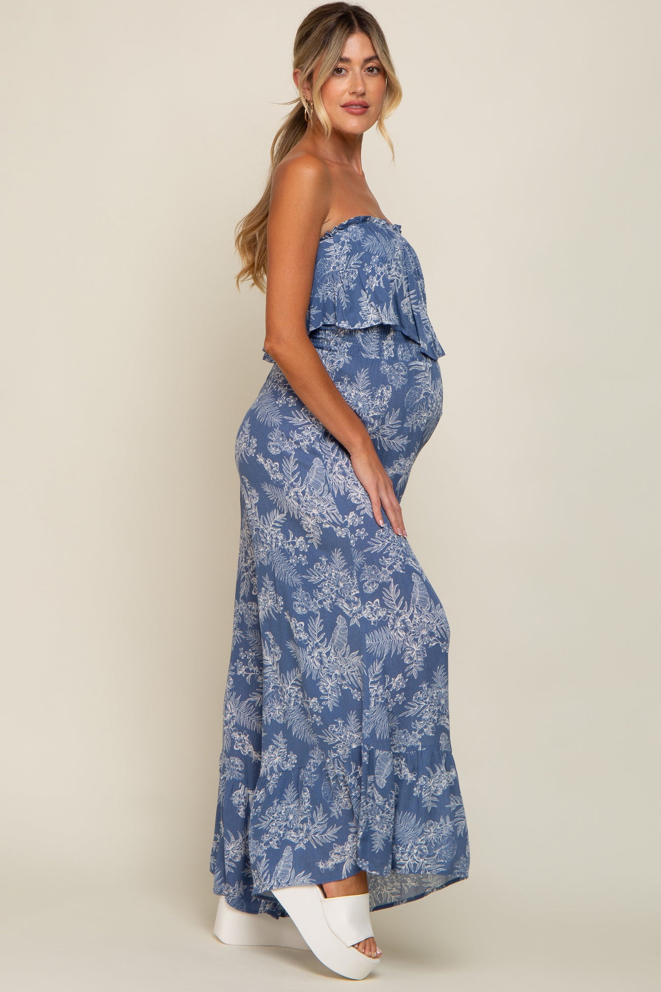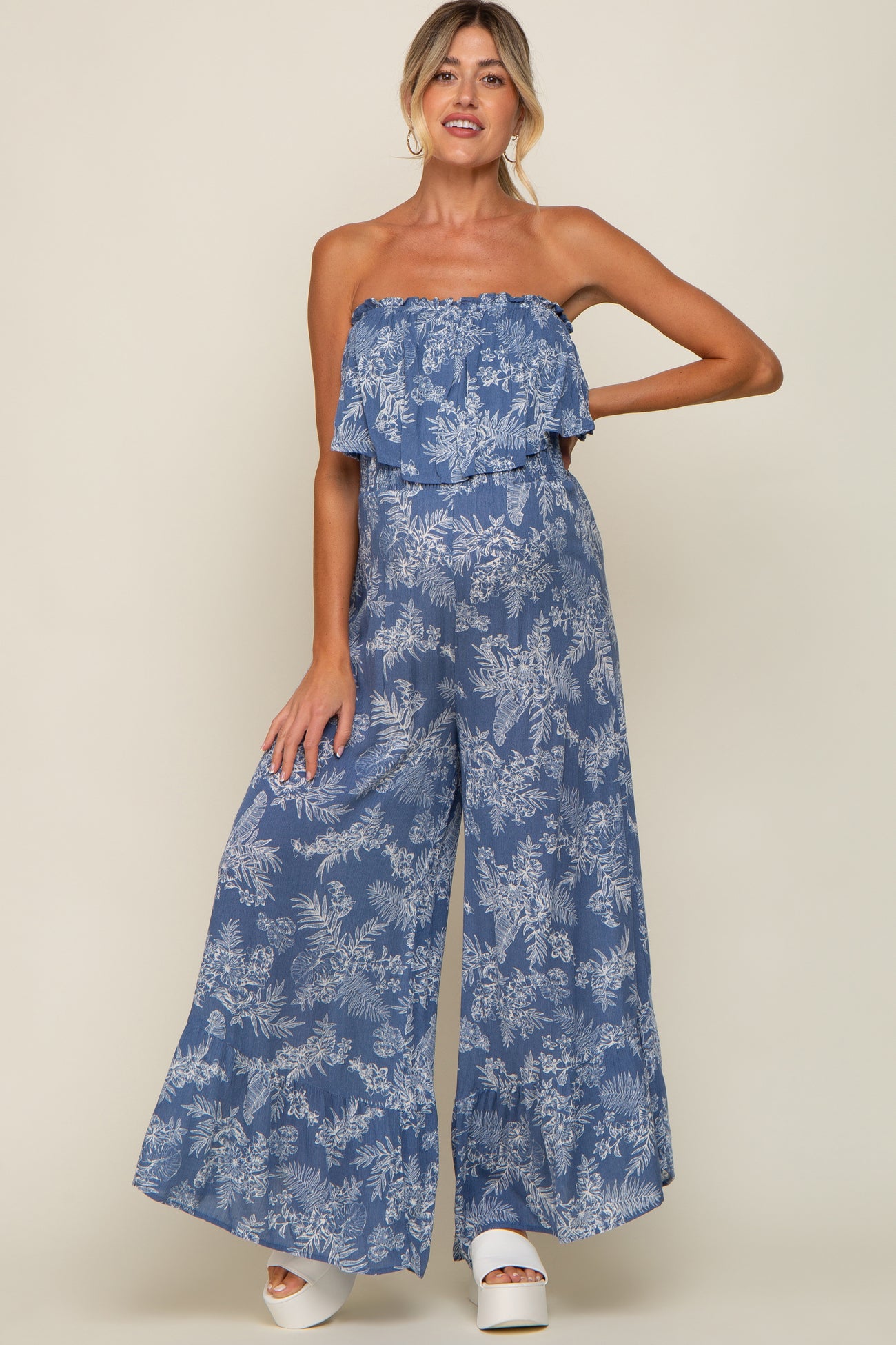 Details A printed maternity jumpsuit featuring a straight strapless neckline with a ruffle overlay, a smocked elastic top and a ruffle hem. Content + Care