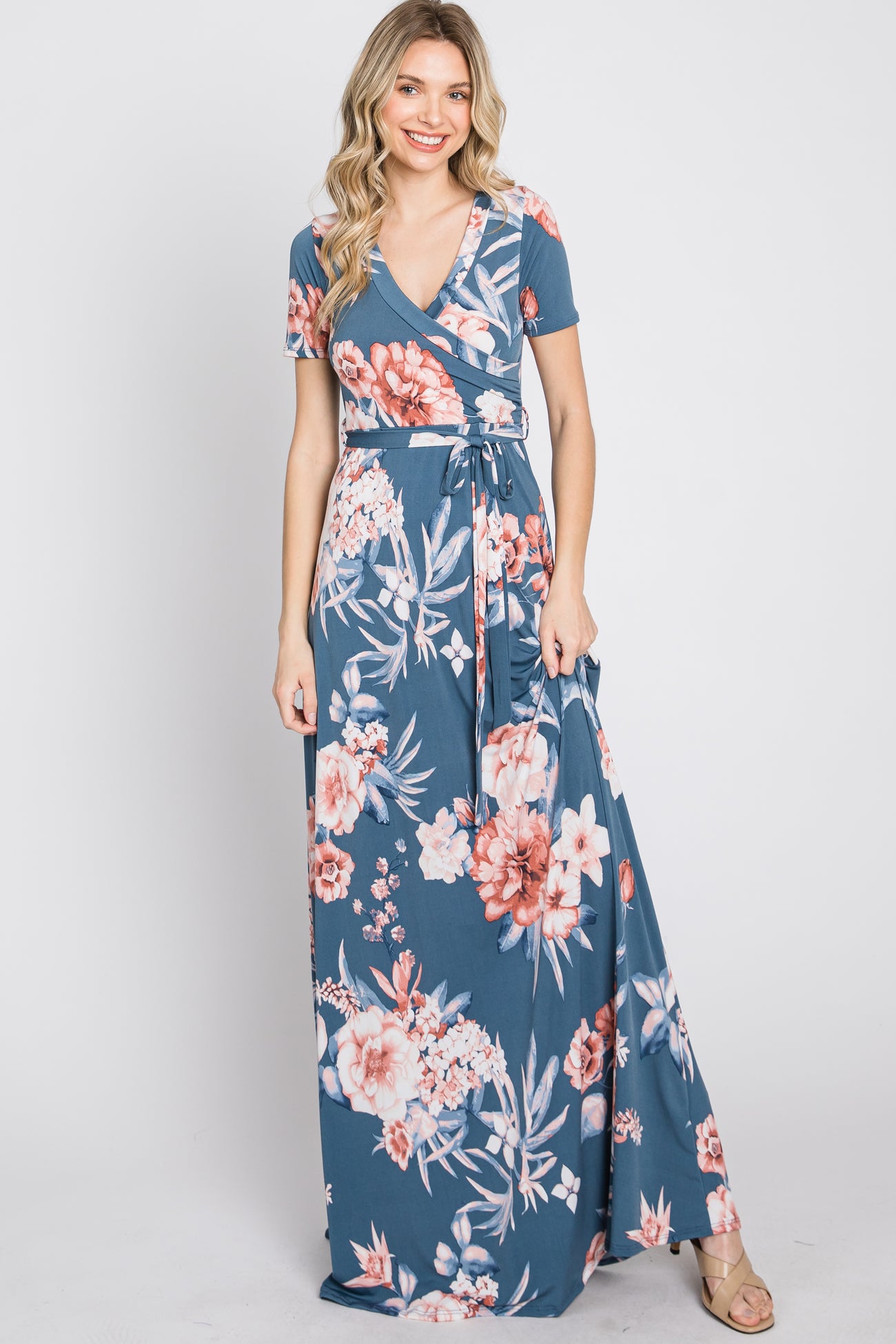 A short sleeve floral print maxi dress in a wrap style with a sash tie waist.
