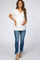 A pair of medium wash maternity jeans featuring a raw hem, five pockets and an elastic belly band.