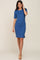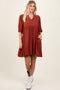 A ribbed dress with short sleeves, a rounded neckline, and a side slit. Dress is knee length.