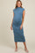 A solid maternity fitted midi dress with side ruching and gathered high neckline.
