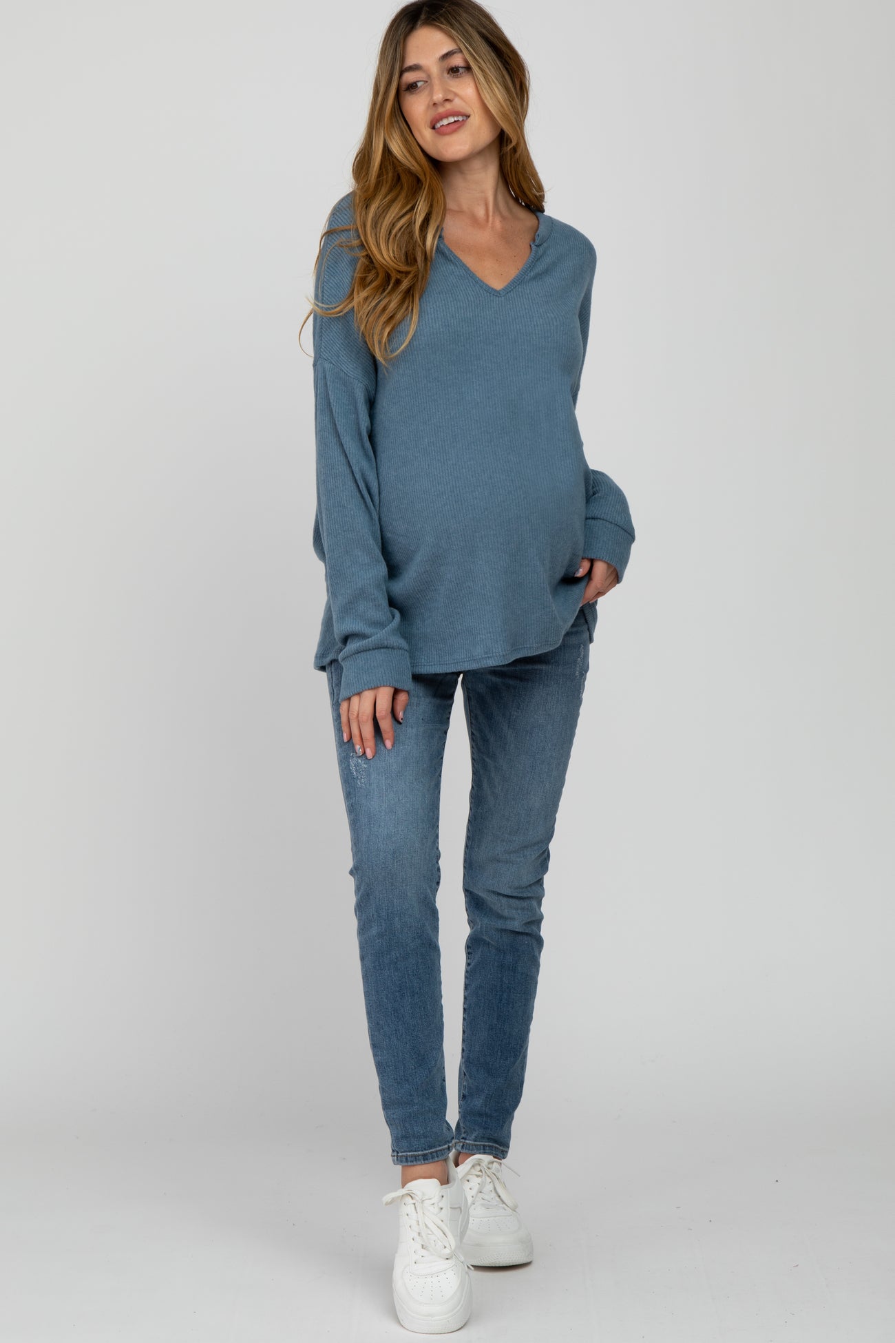 A solid brushed rib maternity long sleeve top with a split neckline.