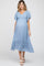 A solid dress with a v-neckline, smocked elastic bust, and ruffle accents. Double lined.