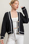A striped maternity oversized blouse with a collared neckline, button down front closure and front pocket detail.