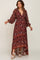A floral print maternity maxi dress with a v-neckline, a smocked waist, long balloon sleeves, a back tie closure, and a hi-lo hem with a slight back train.
