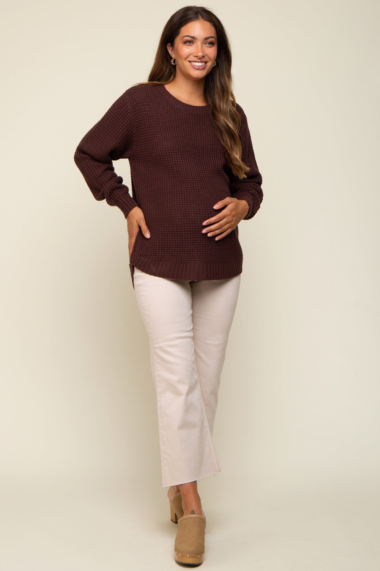 A waffle knit maternity sweater featuring a rounded neckline, long sleeves and a round hem.