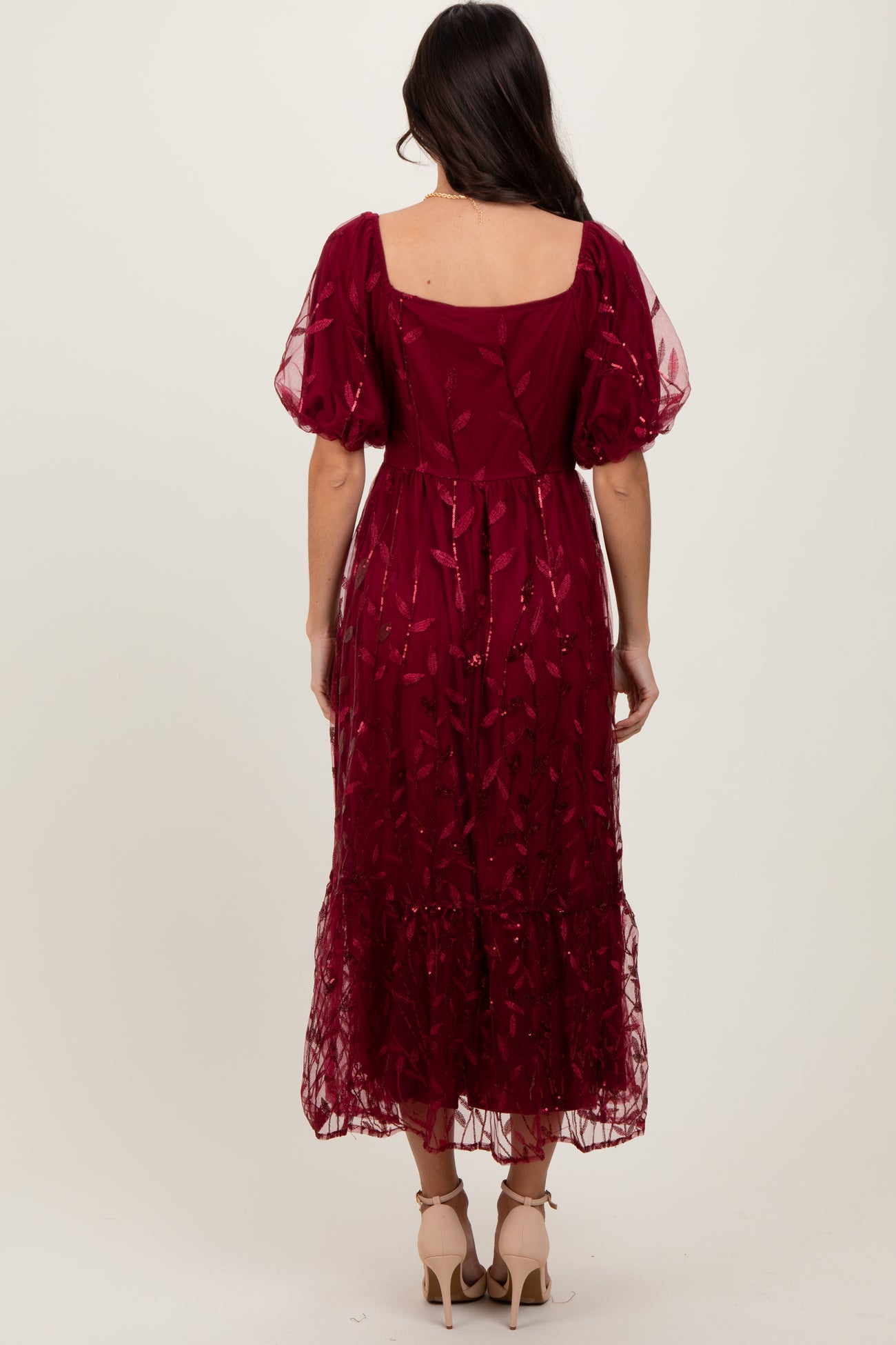Burgundy Embroidered Sequin Detail Mesh Overlay Maxi Dress