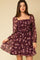 A floral dress with a squared neckline, long semi sheer sleeves, a smocked top, a ruffle accent at the waist, and a gathered bottom tier.