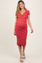 Camel Multi-Striped Button Up Ruffle Sleeve Maternity Midi Dress